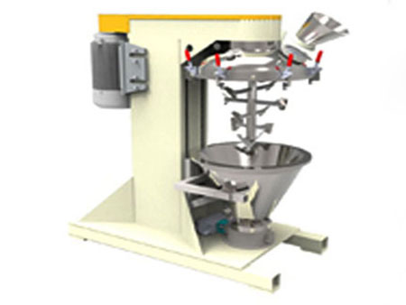 產品通過錐形混合腔頂部投入,投料范圍在30%-100%之間,設備中間有一個頂部驅動的高速轉軸,因此便去除了在產品區域的密封設計以及軸承。在軸上有緊貼內壁的槳式混合原件。通過高速旋轉的攪拌槳和錐形內倉的共同作用將產品由底部帶至混合腔的上部。當產品達到頂部的時候又重新回落到混合倉中心,如此的產品的方式形成了一種快速的宏觀混合。